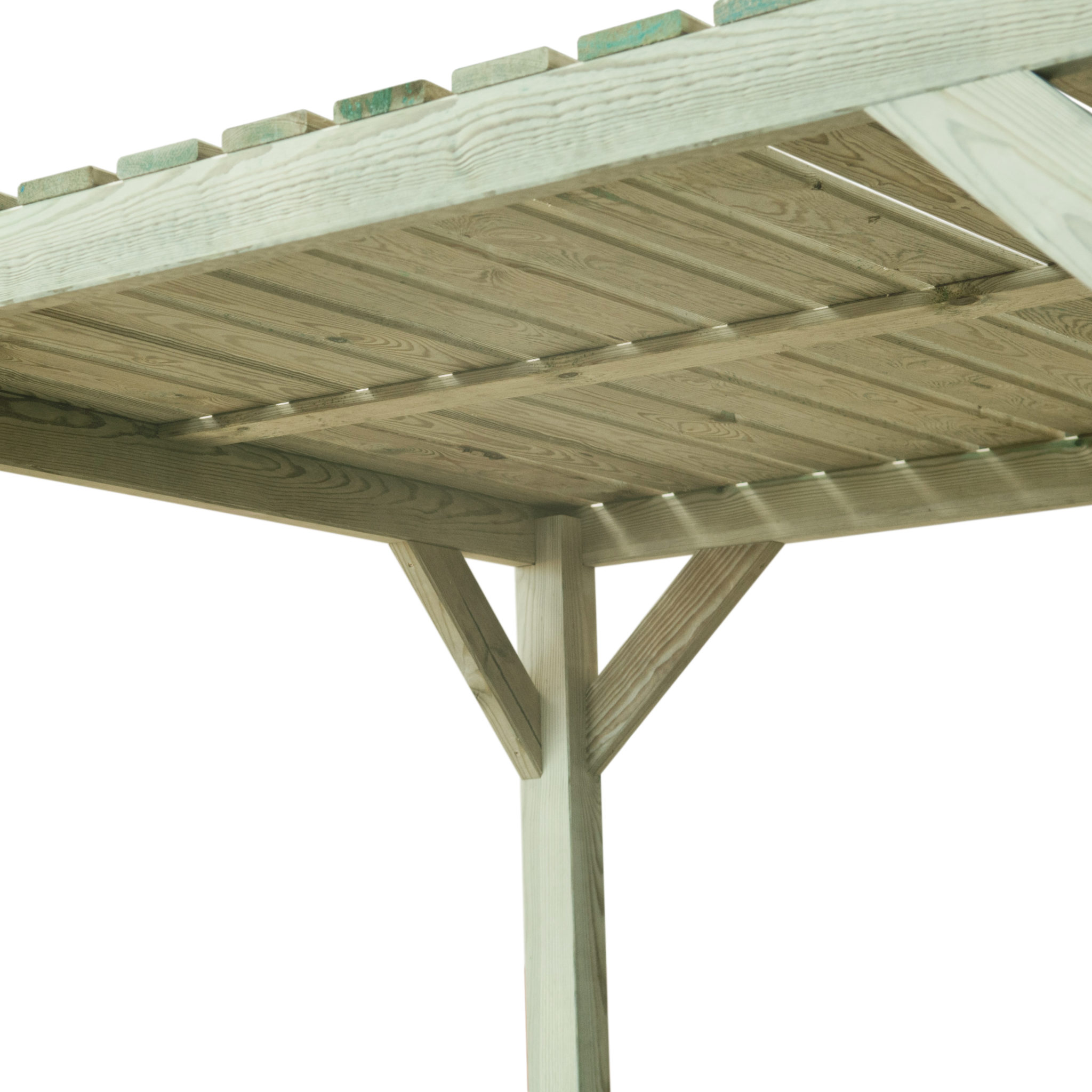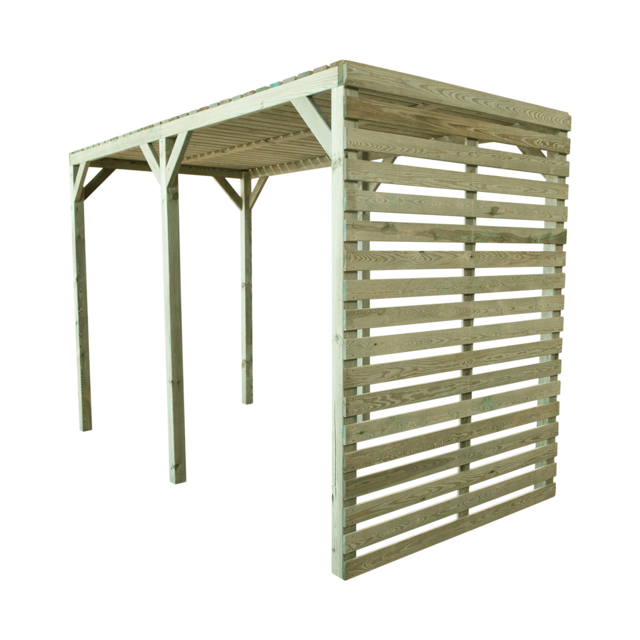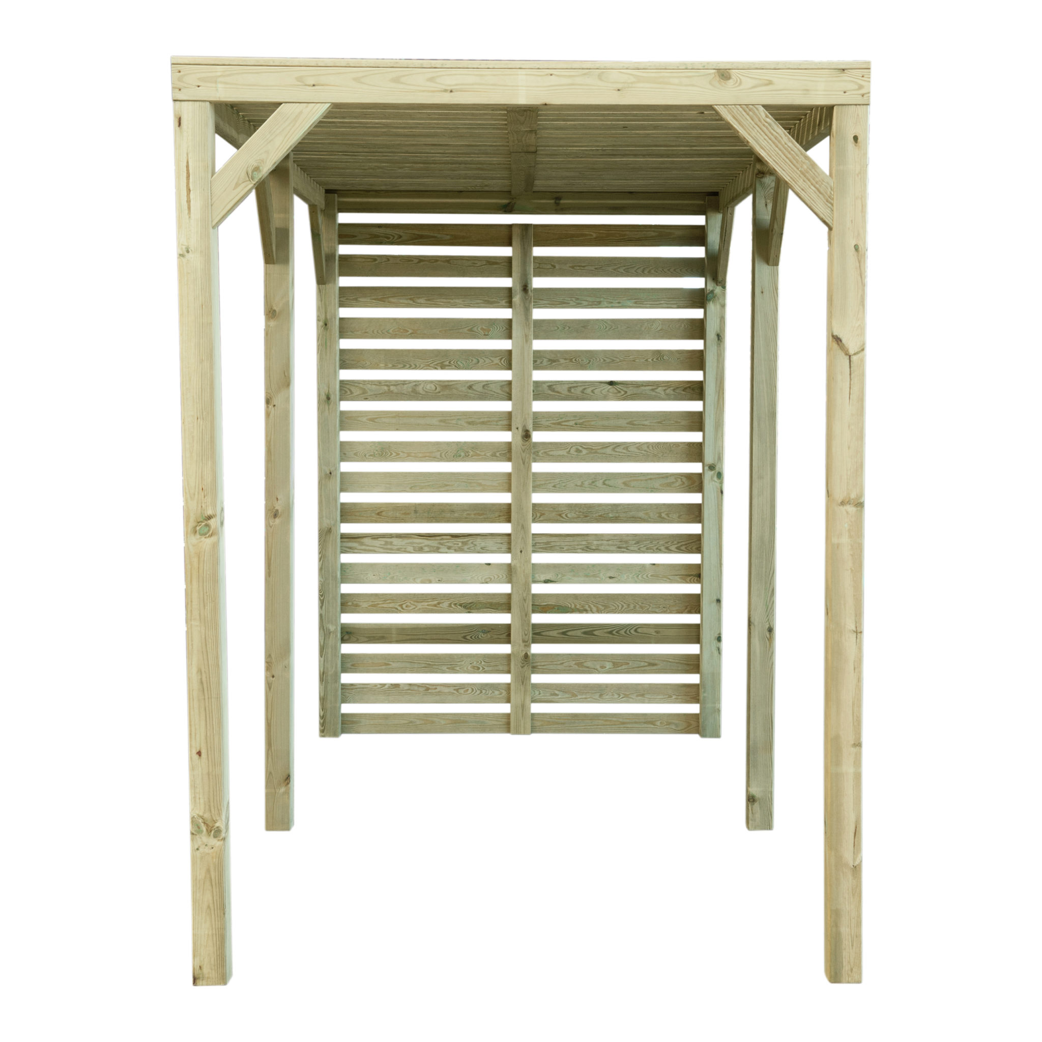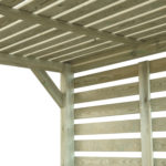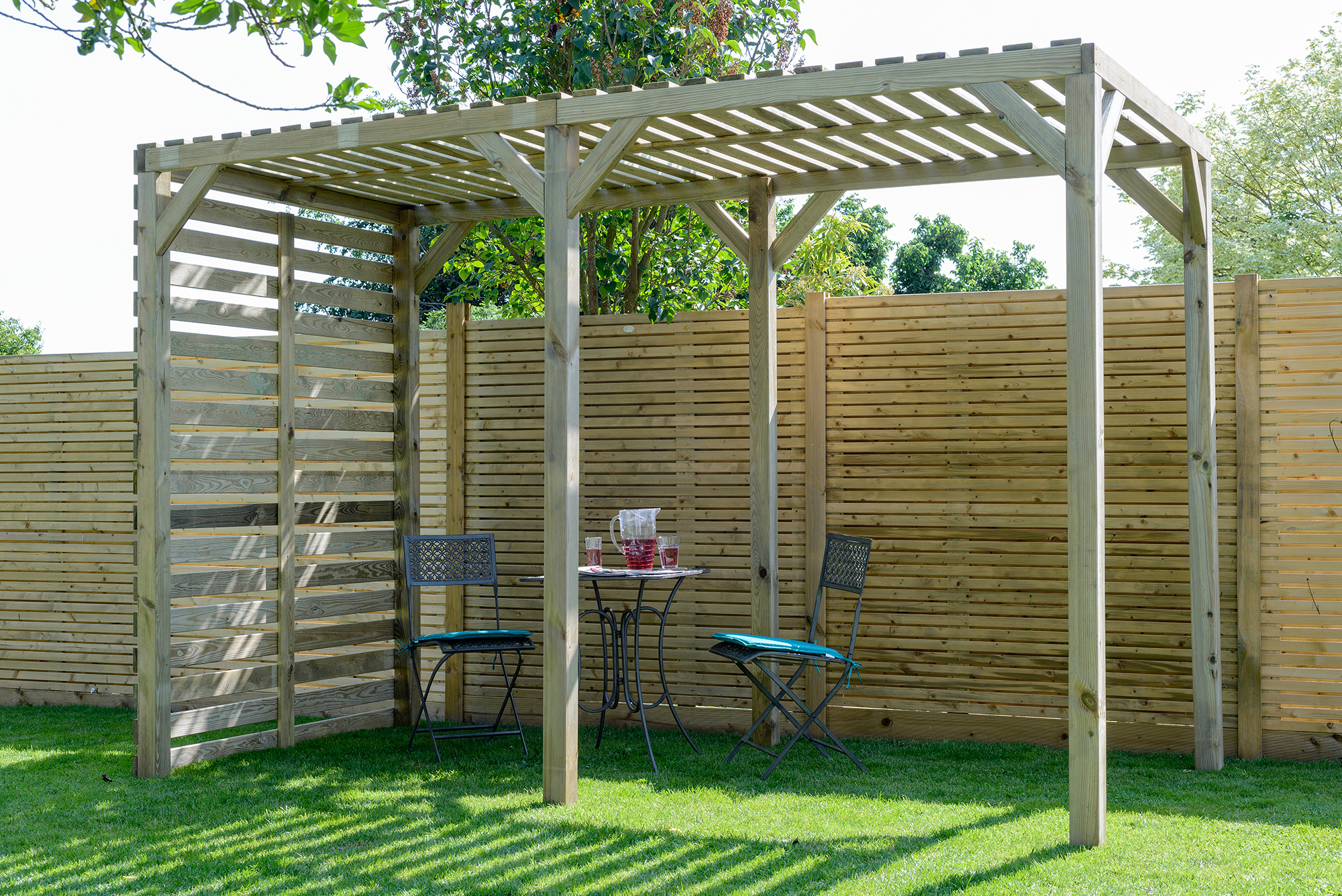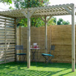 This modern pergola is great for dining and entertaining, the back screen is ideal for hanging plants as well as providing a wind shield.
