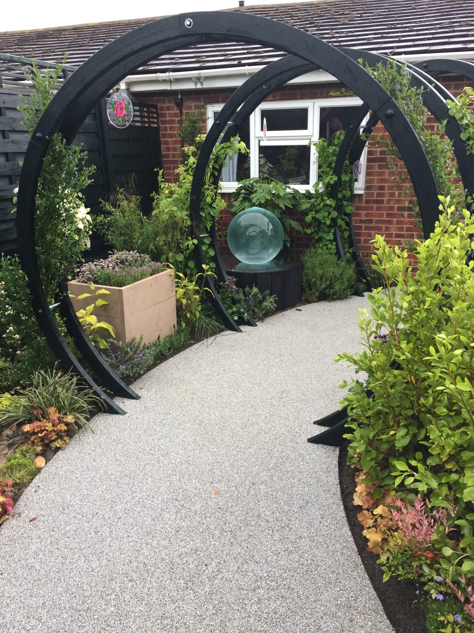 The Contemporary Flower Circle is constructed using two rounded beams closely connected with stainless steel rods to create a sculptural archway.